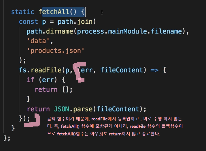 괄호 친 부분은 readFile의 콜백함수이므로 비동기적으로 처리되어 fetchAll함수가 결국 아무것도 return하지 않고 끝나게 된다. 따라서 Controller는 아무런 데이터도 받을 수 없어 에러가 발생한다.