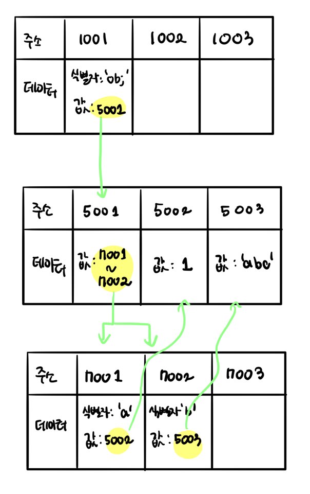 - 즉 참조형은 변수 obj 는 데이터 그룹(여러개의 프로퍼티)이 할당된 주소를 값으로 가지는 메모리 영역의 주소를 값으로 가진다. 그리고 그 데이터 그룹이 저장된 메모리 영역 역시, 해당 프로퍼티들의 값이 저장된 메모리 영역의 주소를 값으로 가진다. (..복잡..)