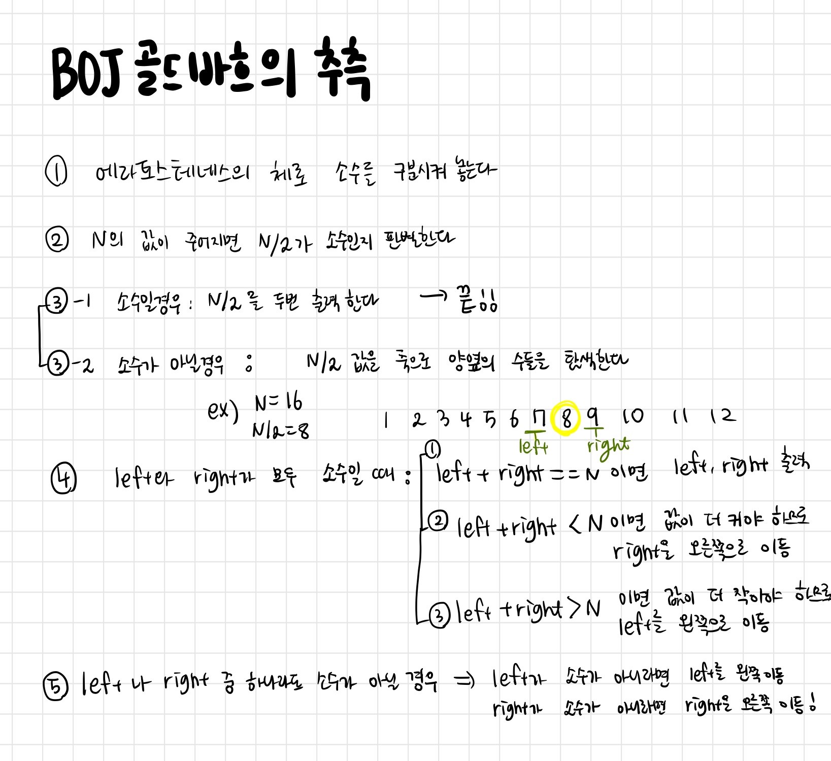 골드바흐의 추측이란? "2보다 큰 모든 짝수는 두 소수의 합으로 나타낼 수 있다" 는 것이다! 이 문제는 골드바흐의 파티션, 즉 짝수 n이 주어졌을 때 짝수 n을 이루는 '두 소수'를 구하는 문제이다.