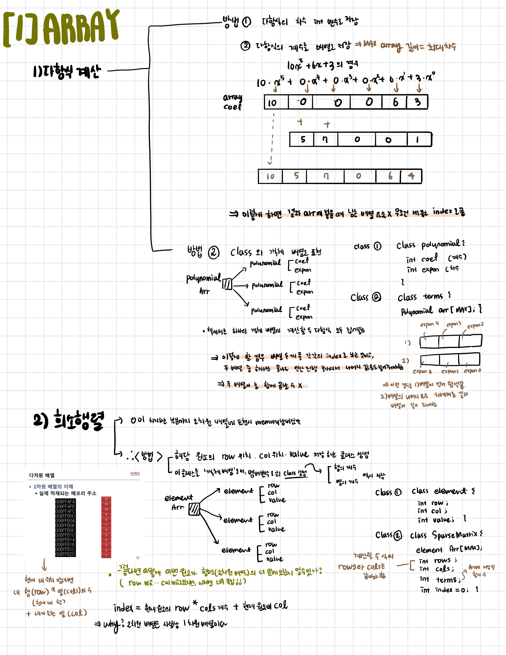 여기까지가 기초적으로 array를 활용한 대표적인 자료구조인 다항식과 희소행렬이었다.