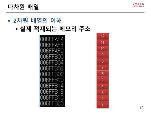 이는 C/C++에서 배열 요소들이 저장되는 순서와 같다. (2차원 배열은 우리가 보기 좋으라고 2차원으로 그려놨지만 실제로는 하나의 배열일 뿐인 것을 기억하자.)