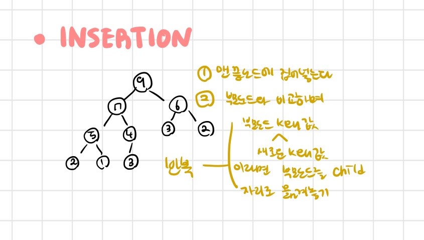 2) 새로운노드 값과, 현재 자식노드와 부모노드와 비교하며, 부모노드보다 큰 경우 부모노드를 자식 노드의 자리로 옮겨준다.