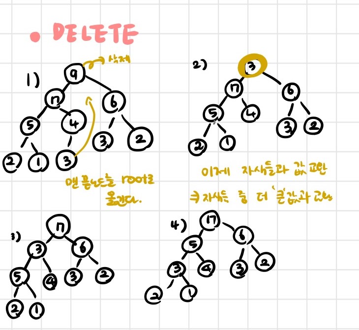 여기서 주의 할 점은, child노드 두개 (왼쪽, 오른쪽 ) 중에 더 큰 값을 parent노드 자리로 옮겨야한다는 것이다.