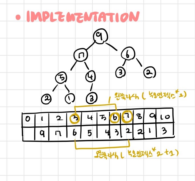 자식노드의 인덱스는 i*2(오른쪽) 와 i*2+1 (왼쪽) 이된다.