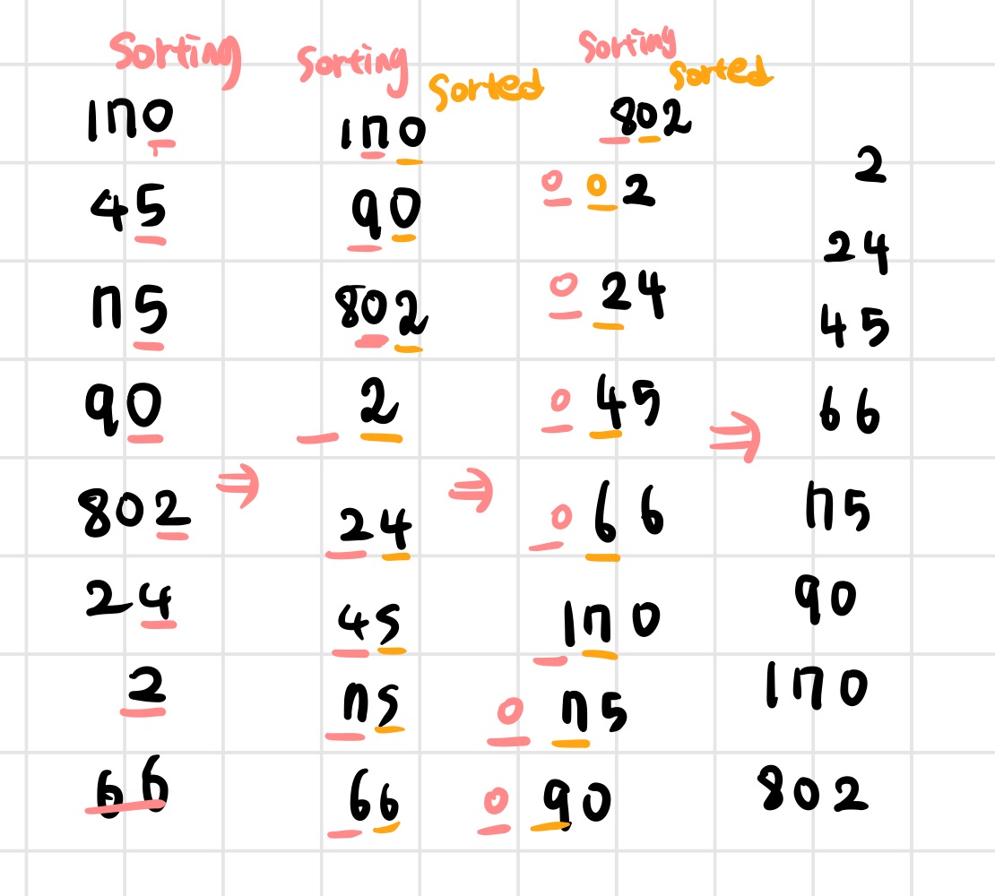 위의 예시는 1의자리수, 10의 자리수, 100의 자리수의 순서대로 정렬 되었다.