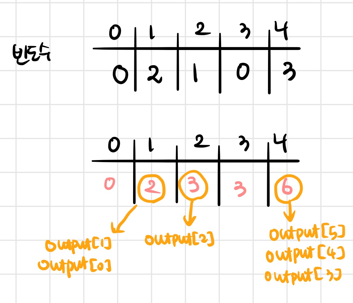 변한 값은 뒤의 숫자 arr[i-1]+arr[i]로, 각 빈도수에 해당하는 숫자들이 output배열에 들어갈 수 있는 인덱스의 내림차순임을 알 수 있다.