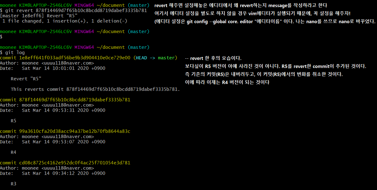 위는 "git revert R5커밋주소"를 실행시킨 후 화면이다. 위에서 설명한 개념과 같이 기존의 R5 커밋이 사라지는 것이 아니라, R5 커밋에서의 변화를 취소하는 것이다.