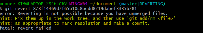 실수로 conflict가 나면 당황하지 말고 git reset --hard를 입력하면 된다. 충돌이 일어나면 revert가 계속해서 fail된다