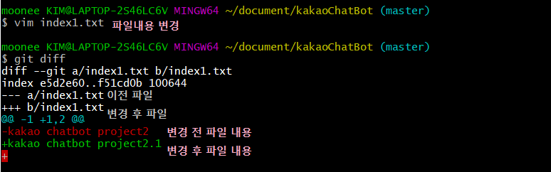 세번째 !! git diff : 소스코드를 변경했을 때 , 가장 최근에 변경한 내용을 알려준다