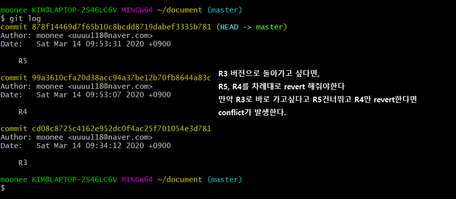 reset처럼 바로 git revert R4라고 한다면 revert에서는 충돌이 발생한다. 왜냐하면, revert는 R4버전~ 그 위의 버전 들을 바로 삭제하는 것이 아니라, R4버전은 그대로 내버려두되, 해당 (R4) 커밋에서의 변화를 취소하는 개념이기 때문이다. 그래서 만약에 R5를 먼저 revert하지 않고 R4를 revert하면, 깃은 R4보다 후에 커밋된 R5를 어떻게 처리해야할지 몰라 conflict가 발생한다.