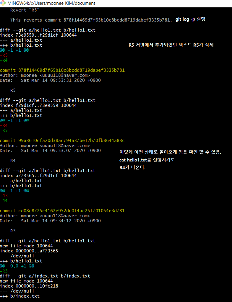 이를 통해 R4 버전으로 되돌아 갔음을 알 수 있다. 캡쳐화면에는 없지만 cat hello1.txt를 쳐도 R5가 아니라 R4가 출력된다.