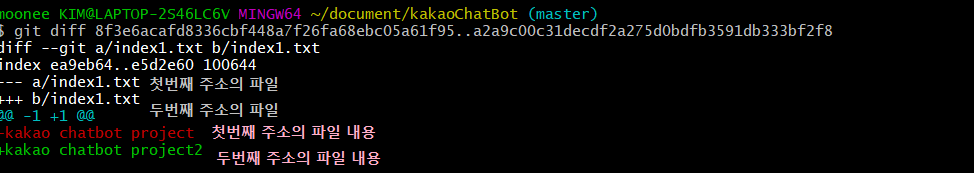 두번째!! git diff 커밋1주소..커밋2주소 : 커밋1과 커밋2사이의 차이점을 알려준다.