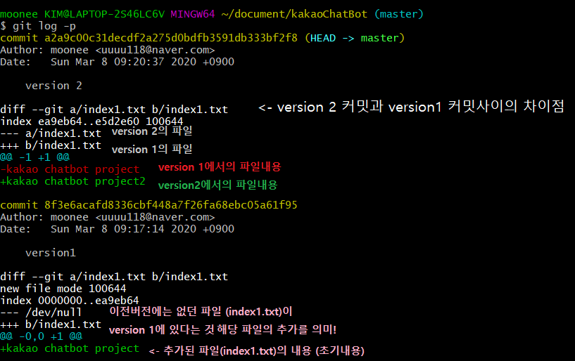 아래가 바로 git log-p 혹은 git diff를 했을 때의 화면 및 각각의 의미이다!
